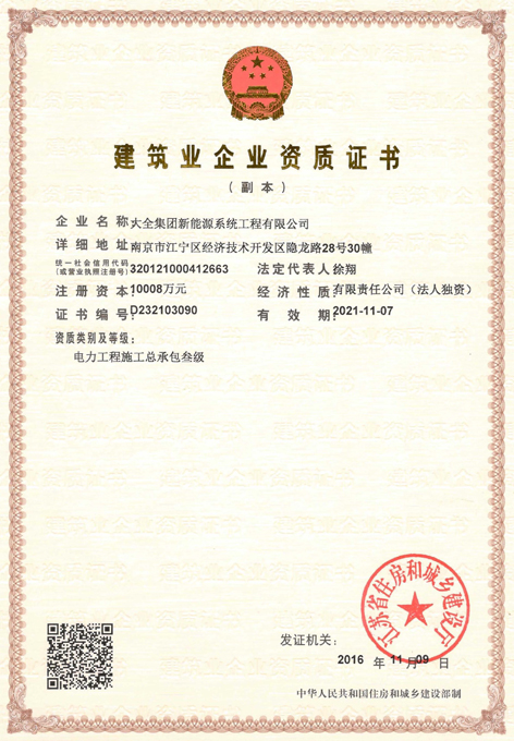 11月9日,大全能源工程取得“电力工程施工总承包(叁级)”资质,为今后公司开拓市场奠定基础。三级资质承包工程范围:单机容量10万千瓦及以下发电工程、110千伏及以下送电线路和相同电压等级变电站工程的施工。