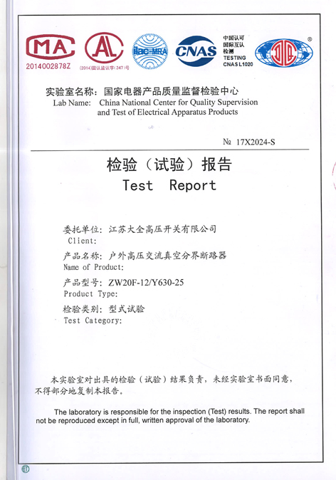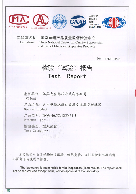 近日,江苏大全高压开关有限公司的ZW20F-12/Y630-25户外高压交流真空分界断路器和DQV-40.5C/1250-31.5户内串联双断口高压交流真空断路器在苏州电器科学研究院委试型式试验,所有试验项次均一次性通过,顺利完成全套型式试验认证。