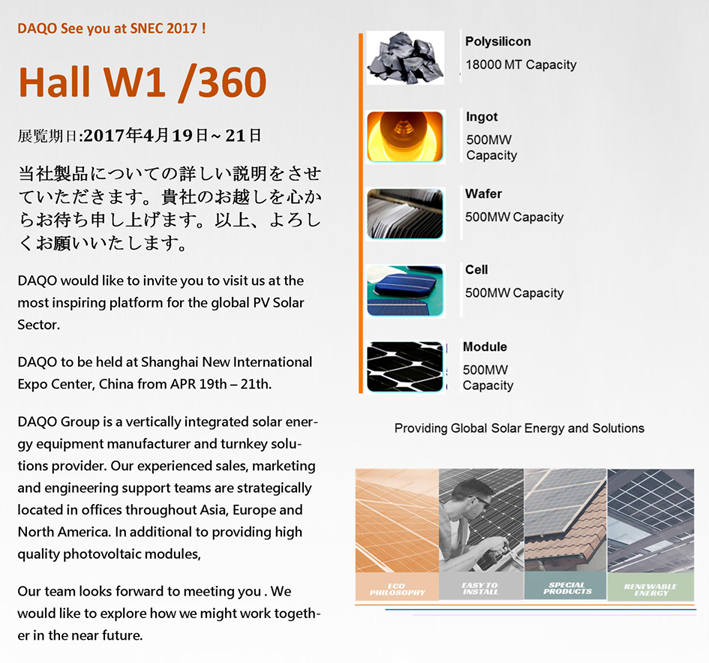 SNEC第十一届(2017)国际太阳能产业及光伏工程(上海)展览会暨论坛将于4月19日在上海国际博览中心隆重开幕。大全作为行业技术领导者,不断创新发展、追求卓越。本次展会不仅带来最完整的光伏产业链产品,更将举行各种活动与新产品发布会,真挚邀请与您相约上海!