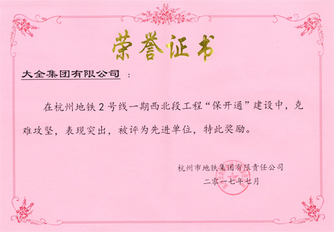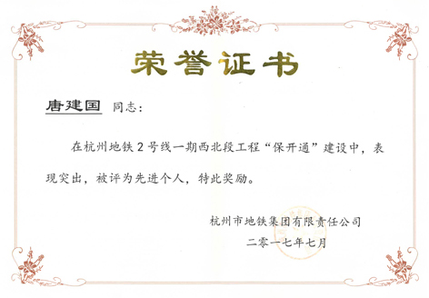 大全默勒荣获杭州地铁集团“先进单位”“先进个人”表彰