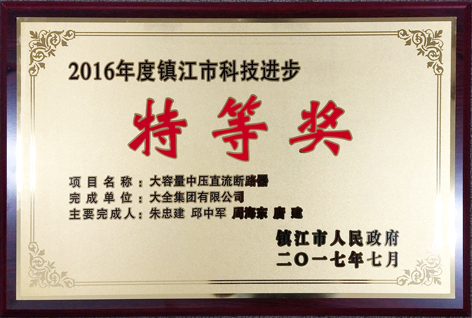 大全集团“大容量中压直流断路器”项目获“2016年度镇江市科技进步特等奖”