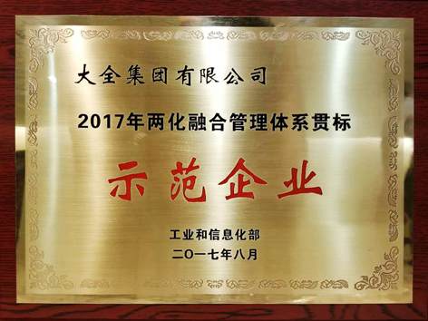 大全集团荣获2017年两化融合管理体系贯标“示范企业”