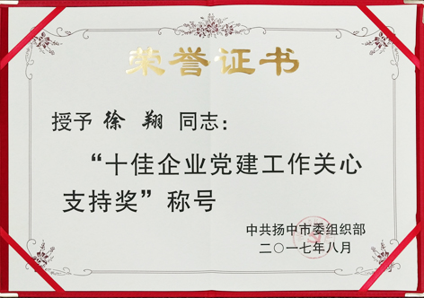 8月28日,扬中市召开全市企业党建工作会议,大全集团总裁,党委书记徐翔获“十佳企业党建工作关心支持奖”。