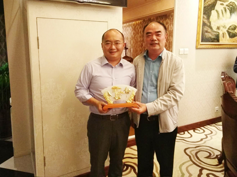 (阳光电源董事长曹仁贤向集团总裁徐翔赠送纪念品并合影留念)
