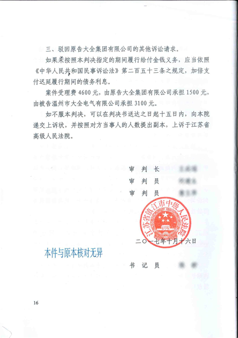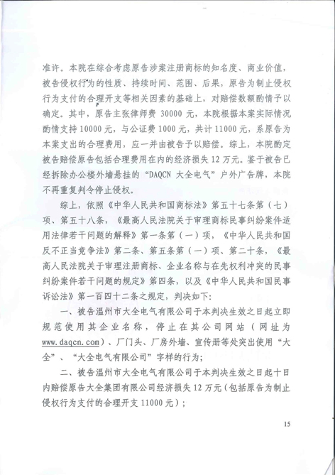 大全集团诉温州大全公司商标侵权案一审胜诉