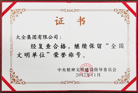 近日,大全集团文明单位的创建工作顺利通过复查,荣获2015-2017年度“全国文明单位”荣誉称号。