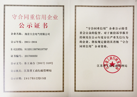 近日,南京大全电气以高分获评江苏省“守合同重信用企业”。证书的取得是对公司诚信经营建设的认可,具有很强的公信力和影响力,南京大全电气将持续秉承诚信经营理念,为助推企业的发展壮大提供坚实力量。