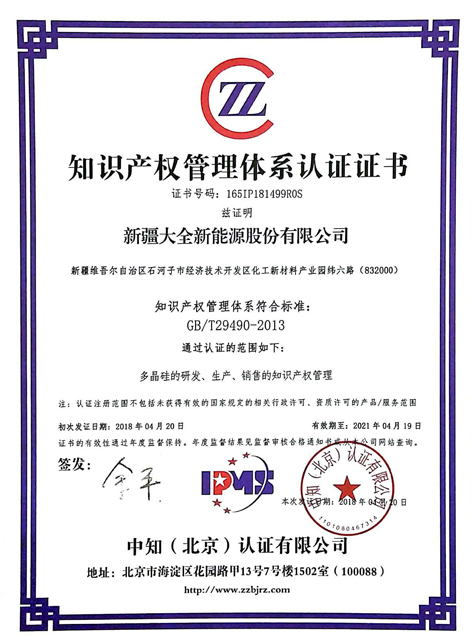 新疆大全新能源取得《知识产权管理体系认证证书》