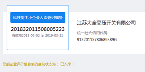 2018年,大全高压开关积极响应集团要求,开展各种项目申报工作。近日,公司顺利取得科技型中小企业入库编号,这使公司2017年度纳税申报享受科技型中小企业加计扣除研发费用75%的优惠。