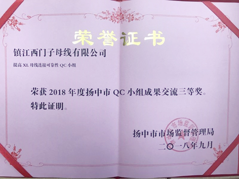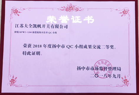 9月26日, 2018年扬中市QC小组质量攻关成果交流会在扬中市市场监督管理局拉开帷幕,全市共有15家代表公司参赛,经过激烈角逐,凯帆开关“降低KFW2-3200驱进机构不良率” QC小组荣获二等奖,镇江西门子“提高XL母线连接可靠性”QC小组荣获三等奖。