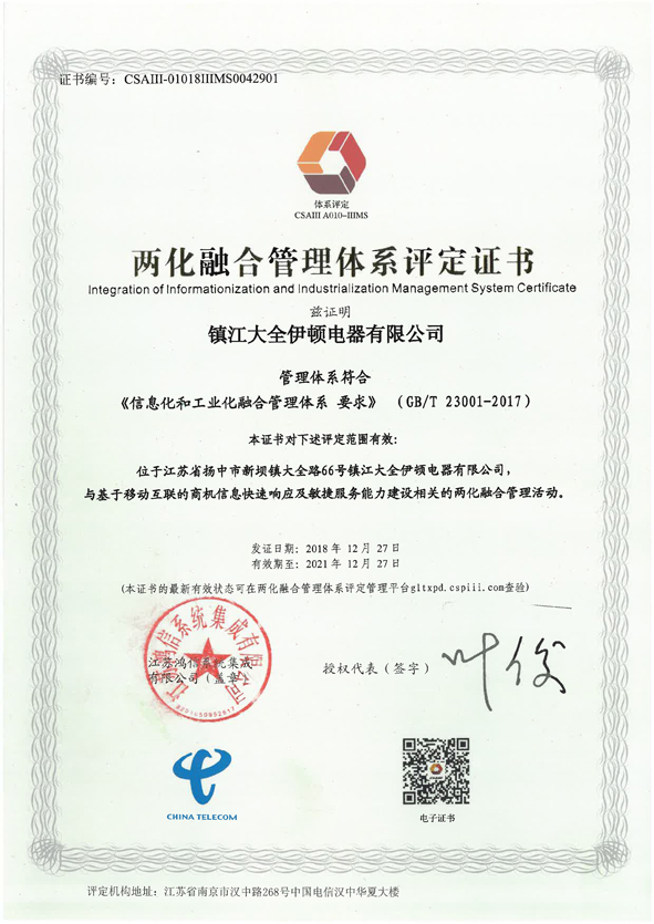 近日,大全伊顿荣获国家工业信息安全发展研究中心颁发的《两化融合管理体系评定证书》。两化融合管理体系认证的通过,标志着大全伊顿在推进信息化和工业化深度融合、一体化管控体系建设方面取得显著成效,已具备应用信息化手段,促进企业效益提高、管理提升的能力,为企业转型升级和创新发展注入了强大动力。