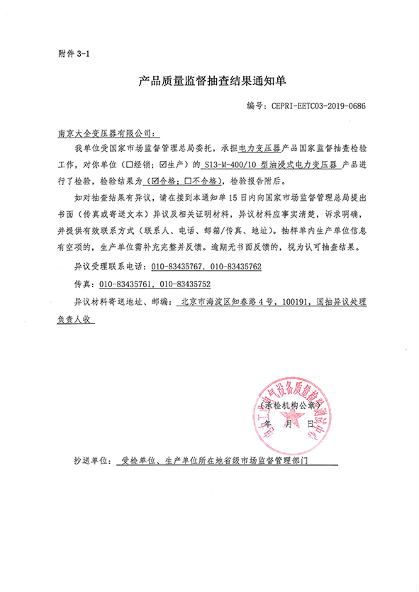 9月12日,大全变压器顺利通过产品质量国家监督抽查,取得国家监督抽查合格通知及检验报告。公司产品通过了电阻、变比、损耗、温升、雷电冲击等试验项目,试验结果合格。此次顺利通过国家抽检,标志着大全变压器公司产品质量稳定可靠,为赢得市场和客户信赖提供了保障。