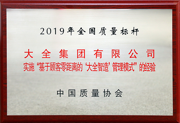 10月24日,中国质量协会对“2019年全国质量标杆”获奖单位进行了授牌。大全集团凭借实施“基于顾客零距离的‘大全智造’管理模式”的经验,荣获2019年全国质量标杆荣誉。