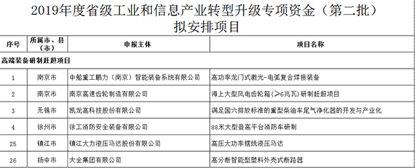 近日,江苏省工业和信息化厅“2019年度省级工业和信息产业转型升级专项资金(第二批)拟安排项目”完成公示,大全集团2016年中标的省高端装备研制赶超工程招标项目“高分断智能型塑料外壳式断路器”经过两年时间的研制,于2019年项目顺利通过招标验收,此次工信厅安排验收后续资金支持。