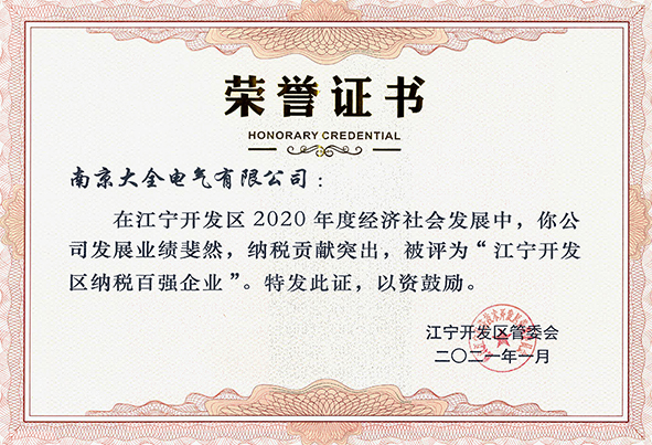 近日,南京大全电气有限公司被江宁开发区授予2020年度“江宁开发区纳税百强企业”。