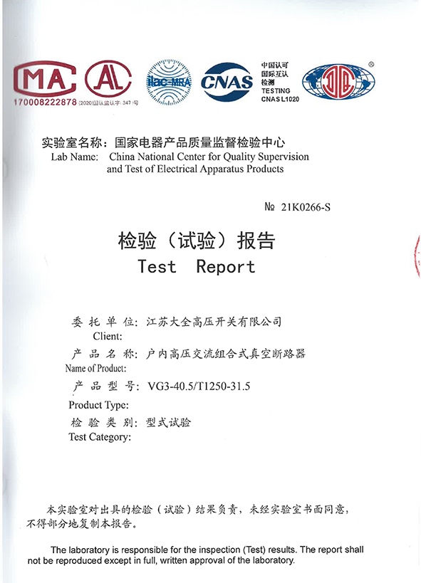 近日,江苏大全高压开关有限公司新研制的VG3-40.5/T1250-31.5户内高压交流组合式真空断路器,顺利通过了国家电器产品质量监督检验中心全套型式试验并取得报告。