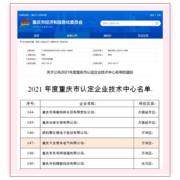 9月27日,重庆大全泰来电气有限公司技术中心通过了重庆市经信委、财政局、税务局、海关等四部门的认定,获批“重庆市企业技术中心”称号。
