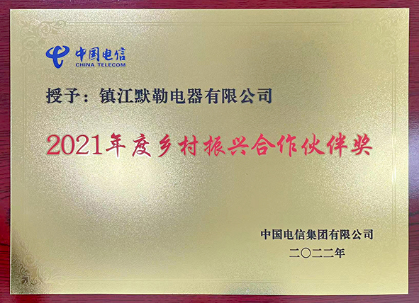 近日,镇江默勒电器有限公司荣获中国电信集团有限公司颁发的“2021年度乡村振兴合作伙伴奖”。