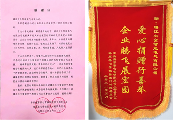 扶贫济困是中华民族的传统美德,坚持履行企业发展成果与社会共享是大全集团的企业文化理念,镇江大全智能电气有限公司秉承集团精神,有责任和义务回馈社会,尽绵薄之力帮助更多有需要的人,做爱心传递者,为和谐社会的建设贡献力量!