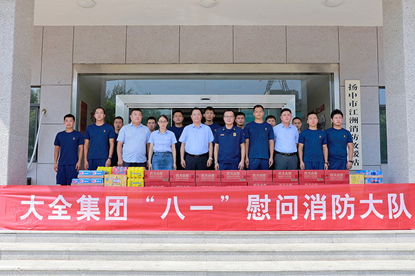 在“八一”建军节到来之际,7月27日下午,大全集团到扬中市消防大队慰问全体消防队员,为他们送上矿泉水、饮料等抗暑降温慰问品和节日的问候,感谢他们为地方建设所作出的贡献。