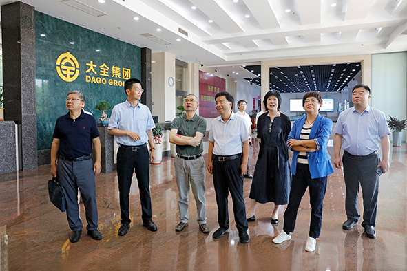 8月8日,江苏省教育科技工会主席寇芳,工人日报江苏记者站站长王伟,镇江市政协党组副书记、副主席、市总工会主席高国成一行在扬中市总工会主席祝寒冰的陪同下到大全集团调研。大全集团党委副书记、副总裁、工会主席蔡斌接待。
