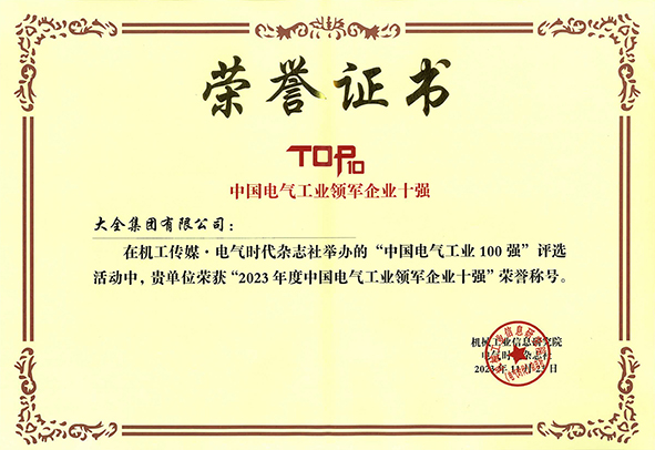 11月23日,第19届中国电气工业发展高峰论坛暨“第23届中国电气工业100强研究”发布会在北京举办。大全集团荣登“第23届中国电气工业100强”榜首,蝉联“2023年度中国电气工业领军企业10强”,获评“2023年度中国电气工业创新企业10强”。