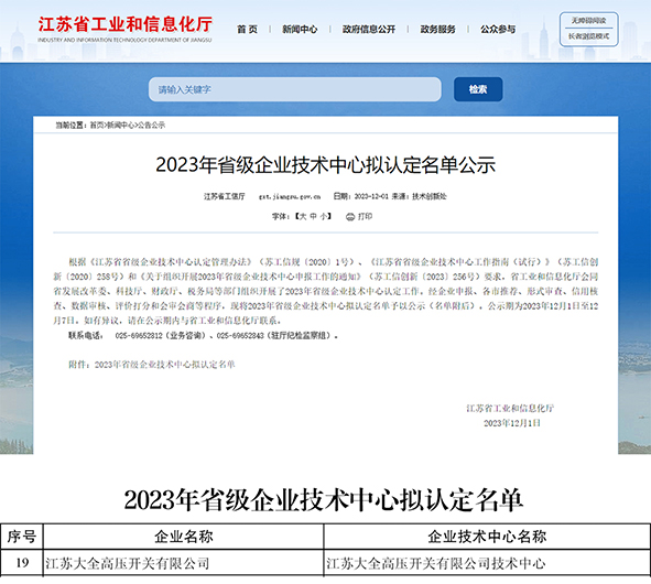 近日,江苏省工业和信息化厅公示了“2023年省级企业技术中心” 认定名单,江苏大全高压开关有限公司技术中心榜上有名。