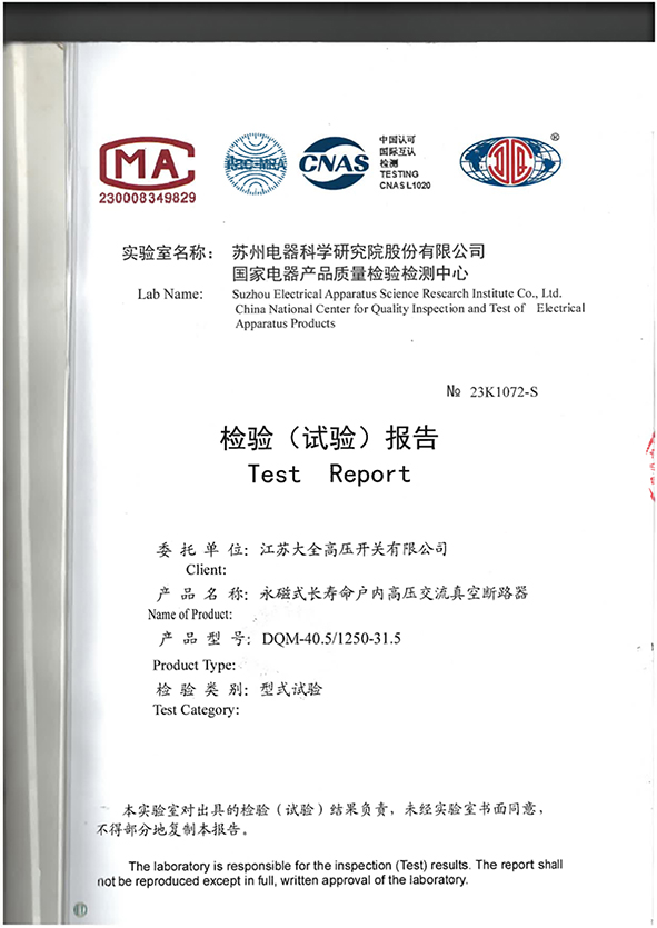 近日,江苏大全高压开关有限公司研发的新产品DQM-40.5/1250-31.5永磁式长寿命户内高压交流真空断路器顺利通过国家电器产品质量检验检测中心型式试验,取得全套检验报告。