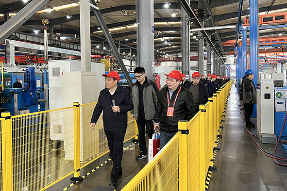 大会嘉宾一行参观了大全变压器铁芯智能制造车间、数字化展厅,了解了企业发展历史、核心产品、数字化生产管理模式等情况。总经理唐建荣详细介绍了大全变压器光伏及储能类变压器产品,并与随行的相关专业人士进行了深入交流。