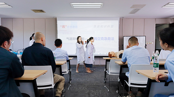 本次培训特邀南京市三甲医院急救医师进行专业授课,围绕除颤仪AED的使用、心肺复苏、气道异物梗阻海姆立克法等方面展开深入浅出的讲解,同时通过模拟场景的形式,指导大家规范操作,加深对应急救护知识的理解。