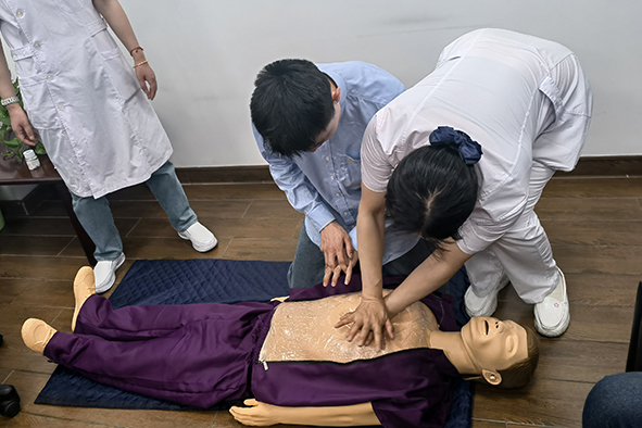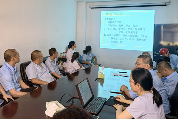 培训现场,医护人员科学讲解、专业示范,围绕“预防中暑”“防暑药品使用”“中暑急救”“心肺复苏”“海姆立克急救法”及AED自动体外除颤器操作等急救知识进行了系统的模拟讲解和实操演示。参训人员认真聆听、现场演练,并不时提出问题,表现出高度的学习热情。通过此次培训,员工们较好的掌握了高温病防治知识和突发性疾病实操处置技能,增强了安全防范意识,提升了应急处置能力。