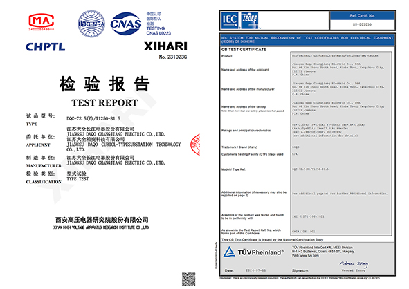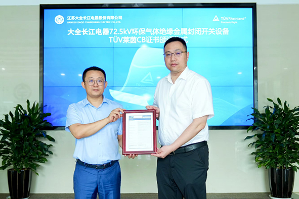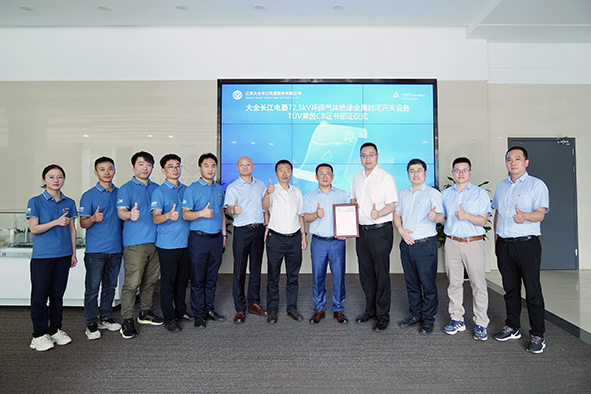 2024年8月9日,经过国际知名检测认证机构德国莱茵 TüV集团(以下简称TÜV莱茵)的检测与评估,江苏大全长江电器股份有限公司(以下简称长江股份)的72.5 kV环保气体绝缘金属封闭开关设备凭借优异的产品性能表现,荣获TÜV莱茵大中华区首张CB证书。这标志着长江股份在无氟环保气体绝缘开关产品领域取得一次重要突破。
