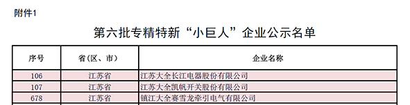 近日,工信部门公布了第六批专精特新“小巨人”企业名单,江苏大全长江电器股份有限公司、江苏大全凯帆开关股份有限公司、镇江大全赛雪龙牵引电气有限公司分别入选国家级专精特新“小巨人”企业,年度入选数量创历史佳绩。