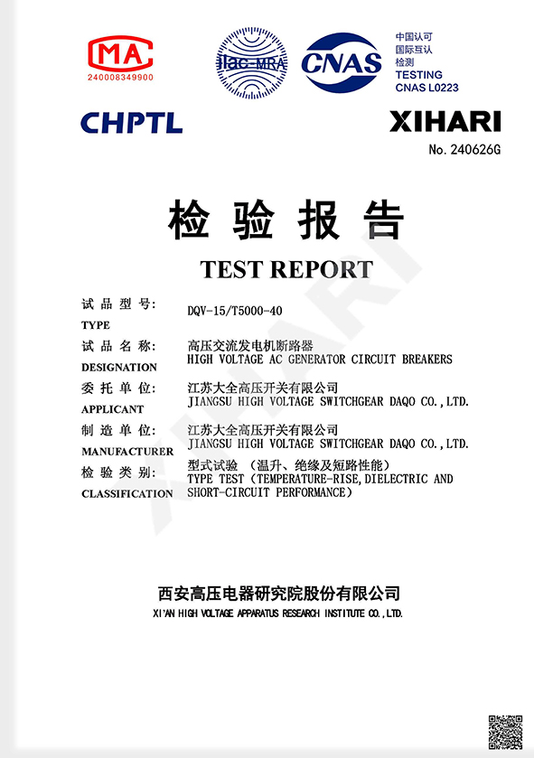 近日,江苏大全高压开关有限公司研发的新产品DQV-15/T5000-40高压交流发电机断路器顺利通过西安高压电器研究院股份有限公司型式试验并取得检验报告。