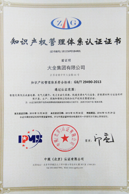 近日,大全集团获得了中规(北京)认证公司颁发的知识产权管理体系认证证书,这标志着大全集团知识产权管理体系符合国家推荐标准GB/T29490-2013,通过认证范围包括智能化高低压成套电器、电气元器件、电力自动化系统、轨道交通电气化设备、新能源材料与设备的研发、生产、采购和销售过程的知识产权相关管理活动。