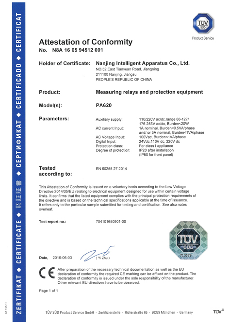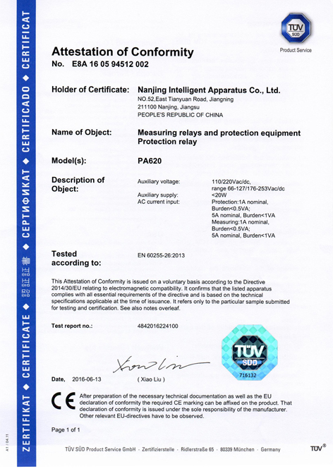 近日,南京因泰莱公司PA620系列数字化保护测控装置通过了TüV南德认证检测公司的试验检测,符合CE认证标准要求,获得CE认证。