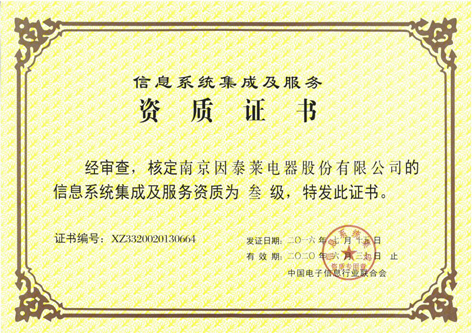 近日,南京因泰莱“计算机信息系统集成及服务三级资质”通过现场评审,获得资格证书。“信息系统集成及服务资质”由中国电子信息行业联合会认定并授予,是衡量企业从事计算机信息系统集成业务综合能力的重要标尺。多年来南京因泰莱一直保持该项资质,不仅标志着公司从事计算机信息系统集成业务的综合能力得到行业专家的认可,同时也为企业获得客户认可、开拓市场创造了有利条件。