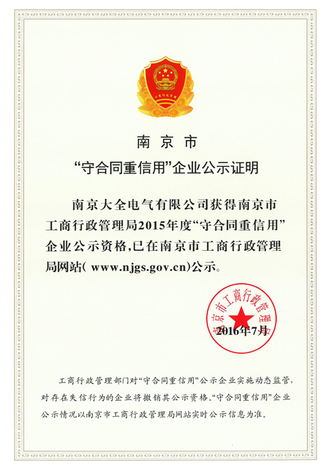 近日,南京大全电气荣获南京市“重合同守信用”企业称号。