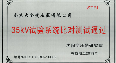 10月18日,大全变压器获得由沈阳变压器研究院颁发的“35KV试验系统比对测试通过”铭牌。此铭牌的获得对大全变压器试验室精度给予充分的肯定,标志着大全变压器试验室的精度与沈阳变压器研究院的试验室精度比对无差异。